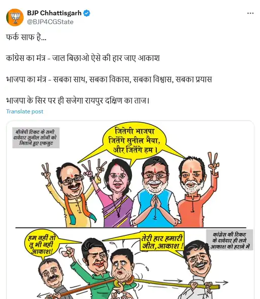 कांग्रेस प्रवक्ता धनंजय ठाकुर ने कहा कि बीजेपी के पास जनता को दिखाने के लिए कोई ठोस काम नहीं है, इसलिए वह कार्टून और प्रोपगेंडा का सहारा ले रही है। उन्होंने आरोप लगाया कि भूपेश बघेल ने किसानों की कर्जमाफी, धान खरीदी और रोजगार सृजन जैसे काम किए, जिन्हें छुपाने के लिए विपक्ष इस तरह की नीच राजनीति कर रहा है।