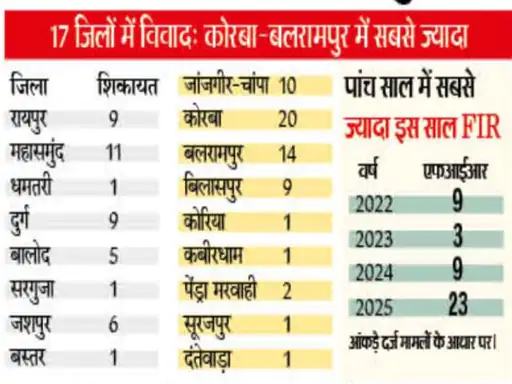 इन मामलों में पुलिस ने अब तक कुल 44 प्राथमिकी (FIR) दर्ज की हैं, जिनमें 23 अकेले 2025 में ही दर्ज हुईं। फिलहाल प्रदेश के 17 जिलों में धर्मांतरण से जुड़े मामले चल रहे हैं। सबसे ज्यादा विवाद कोरबा, बलरामपुर, महासमुंद, दुर्ग और बिलासपुर जिलों में हुए हैं, जबकि सरगुजा, बस्तर और सूरजपुर जैसे इलाकों में ऐसे मामले कम सामने आए हैं।
