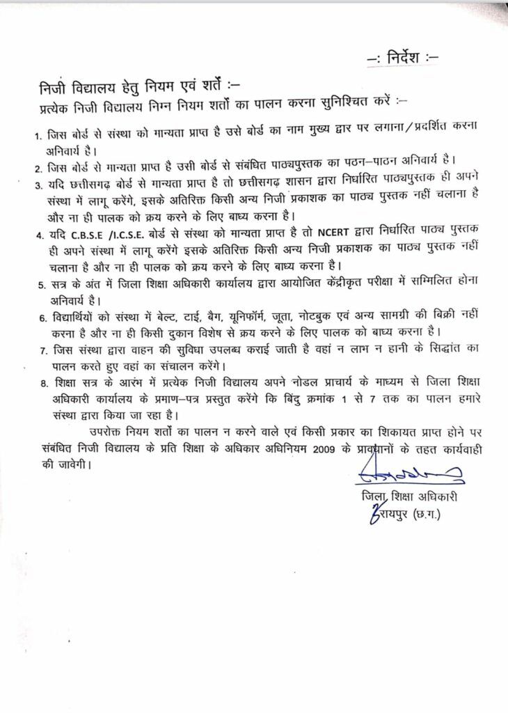 जिन स्कूलों की मान्यता छत्तीसगढ़ बोर्ड से है, उन्हें केवल छत्तीसगढ़ शासन द्वारा निर्धारित किताबों का ही उपयोग करना होगा। वहीं, सीबीएसई और आईसीएसई से मान्यता प्राप्त स्कूलों को एनसीईआरटी की ही किताबें पढ़ानी होंगी। साथ ही, स्कूल परिसरों में किताब, जूते, टाई जैसी चीजों की बिक्री पर भी पूर्ण प्रतिबंध लगा दिया गया है।