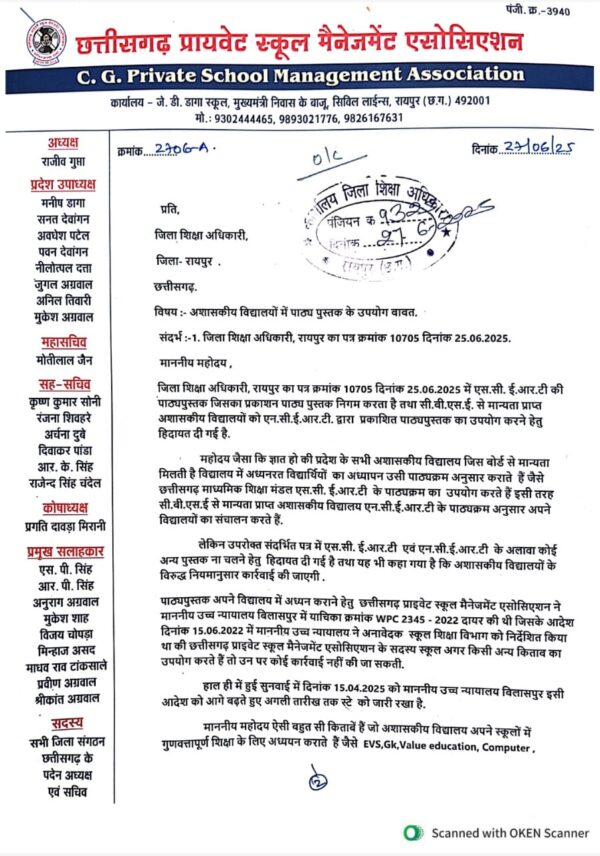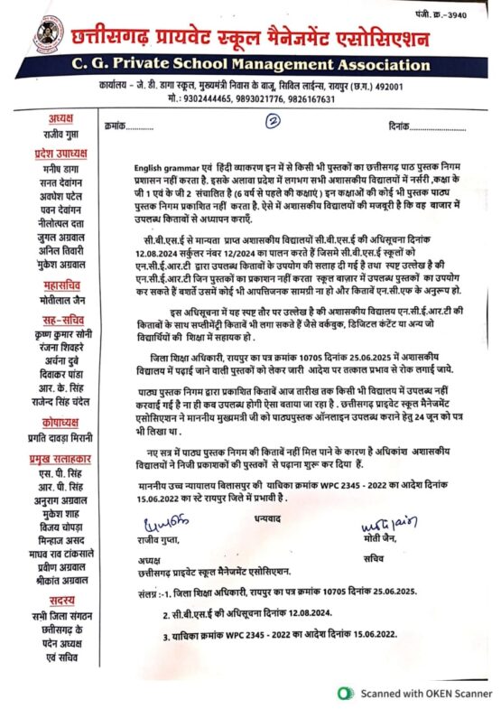 राजीव गुप्ता ने रायपुर के जिला शिक्षा अधिकारी को इस आदेश के विरोध में एक पत्र भी सौंपा है। उन्होंने बताया कि बिलासपुर हाईकोर्ट ने इस मुद्दे पर स्थगन आदेश भी जारी किया है। साथ ही उन्होंने सवाल उठाया कि सरकारी किताबें समय पर स्कूलों तक नहीं पहुंचतीं, इस पर भी प्रशासन को ध्यान देना चाहिए।