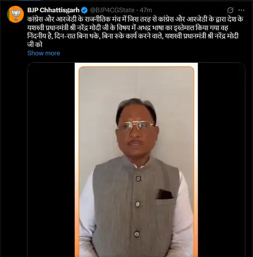छत्तीसगढ़ के मुख्यमंत्री विष्णुदेव साय ने इस मामले पर कहा कि, “पीएम की माताजी पर टिप्पणी करना कांग्रेस और आरजेडी की ओछी राजनीति का उदाहरण है। कांग्रेस की संस्कृति हमेशा ओबीसी और आदिवासी समाज का अपमान करने की रही है, और यह बयान उसी सोच को दर्शाता है।”